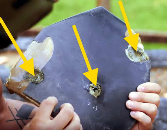 Автор видео обстреливает пластины различными типами бронебойных и зажигательных боеприпасов, ну и главный патрон в видео — Б-32 7,62х54. Стреляет из винтовки Мосина. Результаты теста не очевидны. Хоть у обоих плит 5-й класс защиты, но все попадания с честь, но и сильным запреградным воздействием выдерживает только «Корунд-ВМ». Сталь проигрывает без шансов.