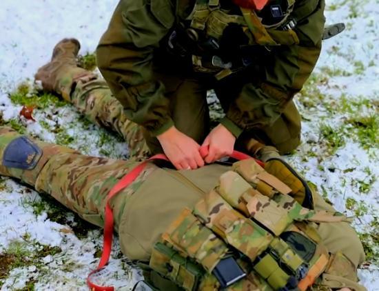 Кровопотеря — главная причина потерь на войне. Как оказать помощь во время боя и самому остаться живым? Рассказывает и показывает действующий инструктор российских спецподразделений. Помогает ему в этом Семён Пегов. Ранение в ногу: автомат в руках, поэтому «пальцевое прижатие» делается при помощи колена или кулака. Нога раненого закидывается наверх и накладывается жгут (правильно — «тактический турник»). Сильно его затягивать не надо — может порваться, раненая нога закидывается на здоровую и раненый оттягивается в безопасную зону.