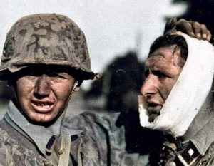 «Только русский может питаться хлебом, который на вкус как кирпич посыпанный сеном, а потом воевать в этом снежном и грязном аду. Я сосал свой сухарь, чтобы хоть как то понять этих красных, стать ближе, но так и не понял.Мы прогрызаем себе путь через горящие кварталы, вокруг чад, грязь и копоть, слезятся глаза, ноги едва идут по этому месиву из грязи […]