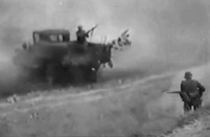 Это почти фантастические кадры, запечатлеть такое на войне удавалось крайне редко.Данная хроника продолжительностью 10 секунд случайно попала в выпуск немецкого еженедельника. Известно, что кадры сняты под Минском в первые дни июля 1941 года.На кадрах хроники видно, что советский грузовой автомобиль в котором были как минимум 3 красноармейца, попал под огонь немцев на дороге и свернул на обочину. Немцы имеют и […]