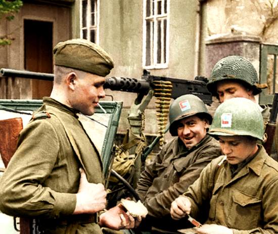 «Сначала я думал, что это просто сувениры на память, всем хотелось чем нибудь поменяться. Их интересовало всё: звездочки с пилоток, ремни наши, обмундирование, каски, шлемофоны наши танковые шлемофоны на ура шли — всё что могли достать. Однако когда к тебе каждый день приходит солдат и говорит, что ему нужно 30-40 пилоток, то понятно, что они хотят привезти это к себе домой и там продать. Война для американского солдата и для русского совсем разная была. Для многих из них это было вроде туристической поездки.Они мне запомнились как нация ушлых дельцов и торгашей. Они постоянно пытались нам что нибудь продать или обменять.