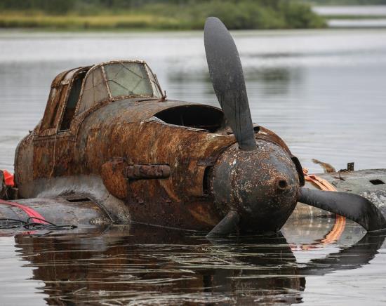 Подъем со дна озера и разборка для перевозки штурмовика Ил-2 летчика А.И.Каличева. Озеро Кулонга в Мурманской области. Самолет будет отреставрирован до летного состояния. Поднят в начале августа 2018