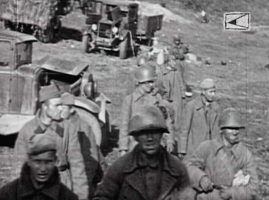 Колона немецкой техники движется в предрассветной заре 22 июня 1941. Впереди и позади бронемашины SD KFZ 222, оператор снимает обочины на цветную пленку — там перевернутые грузовики и брошенные пушки Красной армии, до них уже были бои.