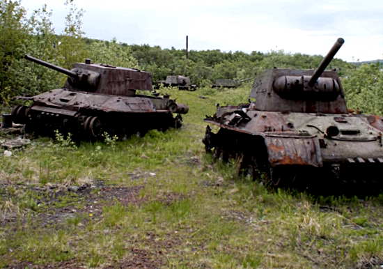 Там стоит два танка ИС-2М с башнями имитирующими танки КВ-1 и КВ-8, а так же ИСУ-152 с искалеченными орудиями. Танки некогда были в экспозиции музея военно-воздушных сил Северного флота в Сафоново, что в 4 километрах на запад от Североморска — добраться туда непросто.