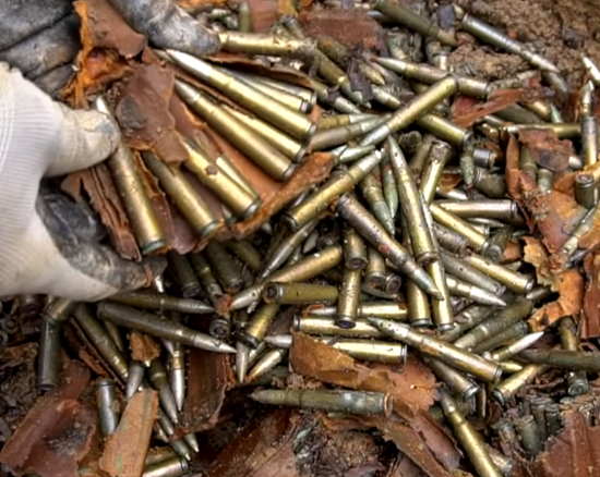 Самой неожиданной находкой дня становится большой ящик немецких патронов к винтовке Маузера в немецком окопе, а так же ведро патронов к штурмовой винтовке MKb.42. Рядом валяются «кексы», переноски от немецких гранат.