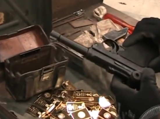 Нарукавная нацистская повязка, большой бинокль с пятидесятикратным увеличением, пистолет Люгера, кружка с отколотой ручкой и подсумок набитый золотыми слитками с клеймами Рейсхсбанка периода правления Гитлера.