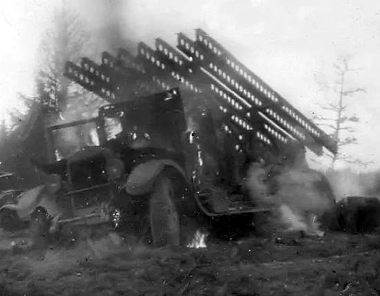 «На залп нам давали пять минут. Объясняю, при залпе не всегда вылетали все мины. Все 12 станков стояли в ряд, в каждом по 8 снарядов, из которых торчат провода, соединенные с общим проводом. Пуск осуществляется динамо-машинкой или батареей БАС-80, очень примитивно всё. Где-то оборвется проводок и несколько мин не вылетают.