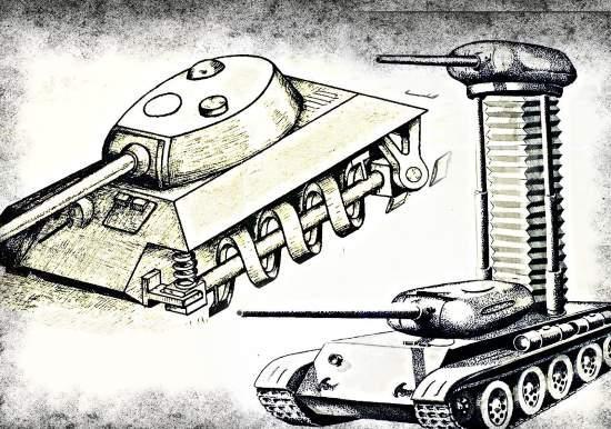 Еще Остапенко предложил движущийся ДОТ с толщиной стенок 600-мм. Еще была ходовая, предложенная техником-лейтенантом Григоренко для Т-34, она не имела колес и гусениц и похожа на спирали шнекороторной машины.