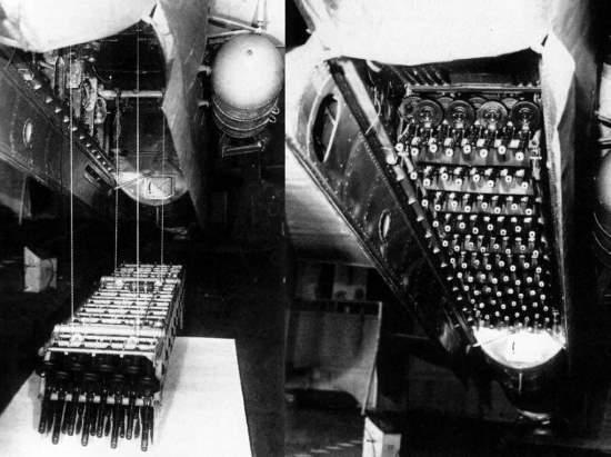 Они собрали платформу, на которой смонтировали 88 ППШ. Они ставились в наклонном положении, 11 рядов по 8 штук в каждом. Каждый ППШ питался из своего штатного магазина на 71 патрон. Перед началом стрельбы пилот открывал створки бомболюка и нажимал гашетку. Для перезарядки самолет возвращался на аэродром, платформа опускалась на тросах и все ППШ перезаряжались. Надо заметить, что опытный самолет с такой установкой был собран только в 1946 году… Далее про испытания.