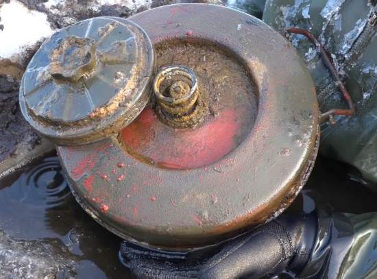 Со дна болото идет какое то невероятное количество мин и снарядов в краске, со всеми маркировками и клеймами. Утоплены все скорей всего после войны советскими саперами. Они и предположить не могли, что через 77 лет туда придут поисковики, выпилят бензопилой лёд болота кубиками и на магнит будут вытаскивать всё на поверхность.
