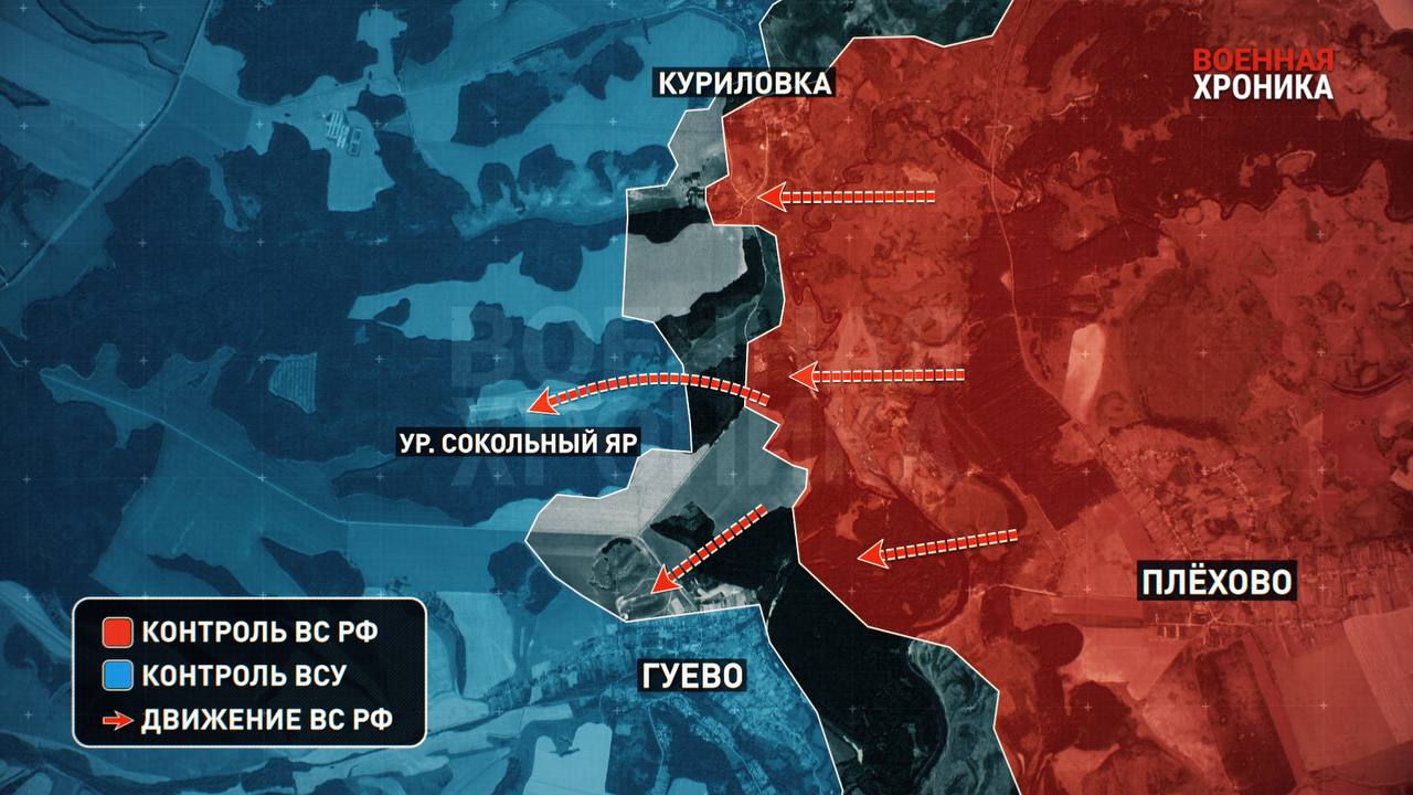 О продвижении ВС РФ на Гуевском направлении Курского фронта. Подразделения 810-й бригады морской пехоты Черноморского флота при поддержке батальона «АрБат» пересекли русло реки Псёл на отрезке урочище Паромское — Куриловка шириной 5,3 км и отбросили формирования 129-й бригады теробороны ВСУ более чем на 1—1,5 км в направлении урочища Сокольный Яр, балки Ковалёва, а также села Гуево.
