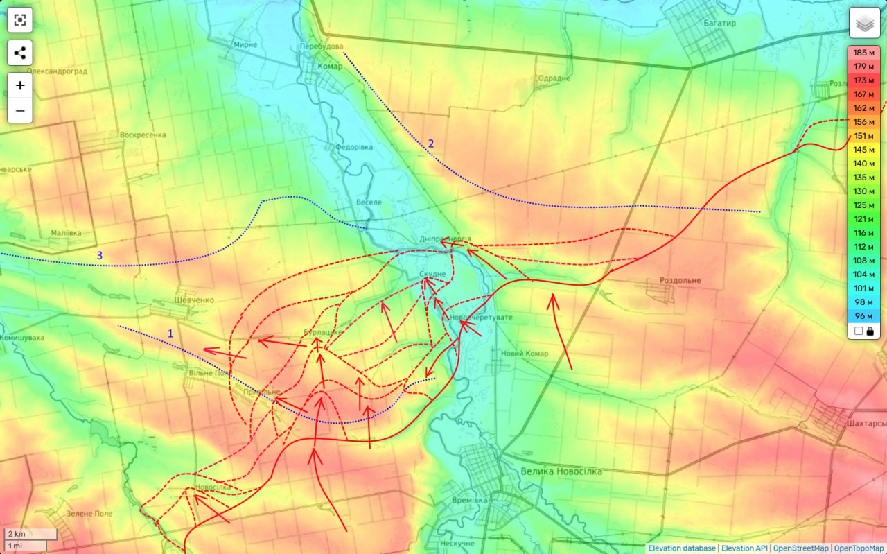 Также идут бои между Днепроэнергией и Раздольным. Наши части пытаются улучшить свои тактические позиции перед штурмом Днепроэнергии, за которую противник держится так же цепко. Что с учетом его значимости и неудивительно.