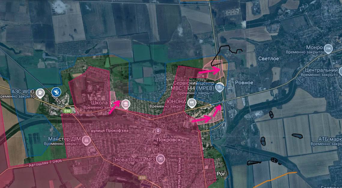 Обстановка на северо-востоке Покровска накаляется: наступающие российские силы сжимают охват вокруг последнего квартала с многоэтажной застройкой, фактически создавая оперативные клещи. Примечательно, что карты обеих сторон конфликта в целом совпадают, расходясь лишь в незначительных деталях, что говорит о ясности оперативной картины.