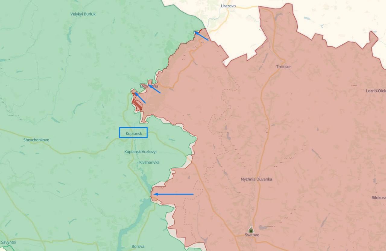 Самые интересные события на фронте сейчас развиваются на север от Купянска. ВСУ не смогли ни уничтожить плацдарм, ни даже его купировать, хотя уже казалось, что он забуксовал, но в ночном обновлении Deepstate обозначил захват ВС РФ половина села Западное, а также форсирование реки далеко на север от основных сил почти у границы.