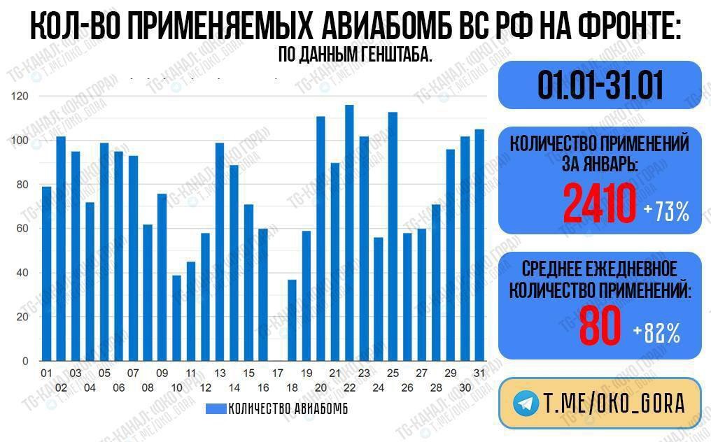 Начало расти количество примененных КАБ после очень сильной просадки. Судя по статистике, октябрь стал рекордным месяцем со 129 штуками в сутки, в ноябре было 110, а в декабре случилась резкая просадка до всего 44 единиц. Многие это связывали с двумя факторами: погода и ТО самолетов, Су-34 массово наблюдали на Энгельс-2. И вот в январе статистика применений стала восстанавливаться, совокупно за месяц в среднем 80 единиц в день, но с ростом ближе к концу месяца.