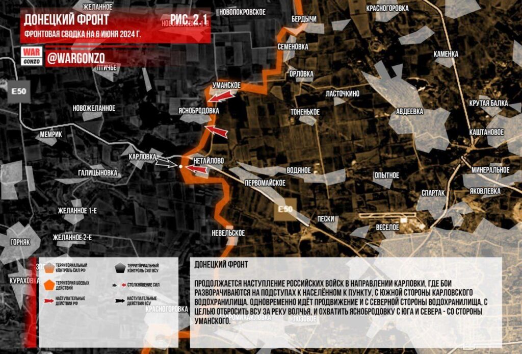 Война на Украине (06.06.24): Часов Яр, Торецкое, Покровское и Кураховские направления… Везде противнику все труднее и труднее удерживать свои позиции, так большая часть резервов переброшена им в район Харькова и Сум. И это дает нашим частям на других участках возможность двигаться вперед.