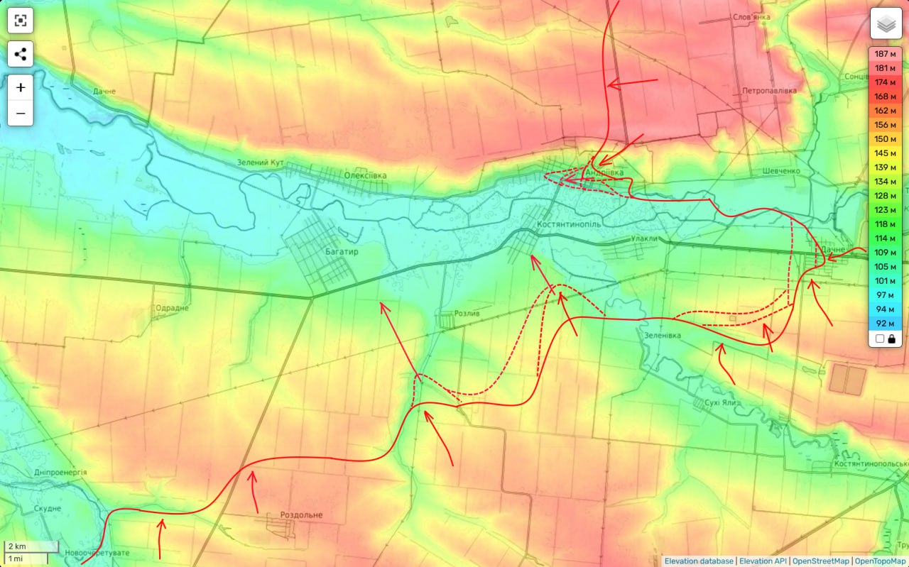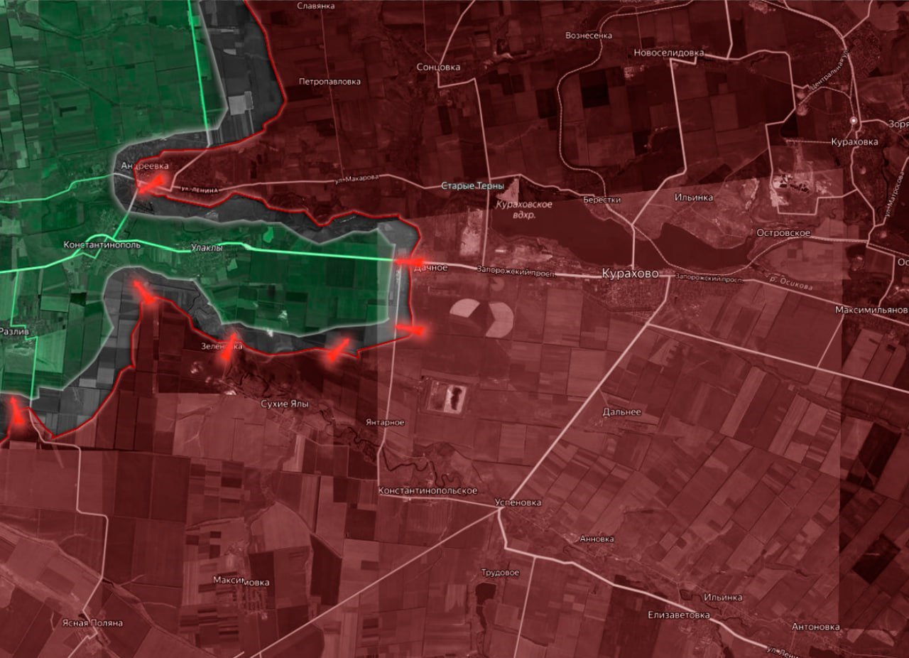 ВСУ усиливают оборону укрепрайонов на господствующих высотах, что позволяет сдерживать дальнейшее продвижение армии РФ. При этом российские войска продолжают попытки прорваться к реке Кашлагач с юга – в районах Константинополя, Разлива и Улаклы. Однако здесь серьёзных изменений линии фронта пока не зафиксировано.