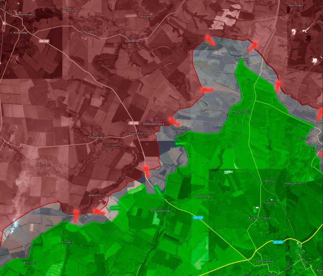 Из н.п. Косица ВСУ выбили подразделения ВС РФ, фиксируется работа украинских ДРГ в районе Бердина. Южнее Суджи, украинская армия пытается контратаковать в районе Махновки.