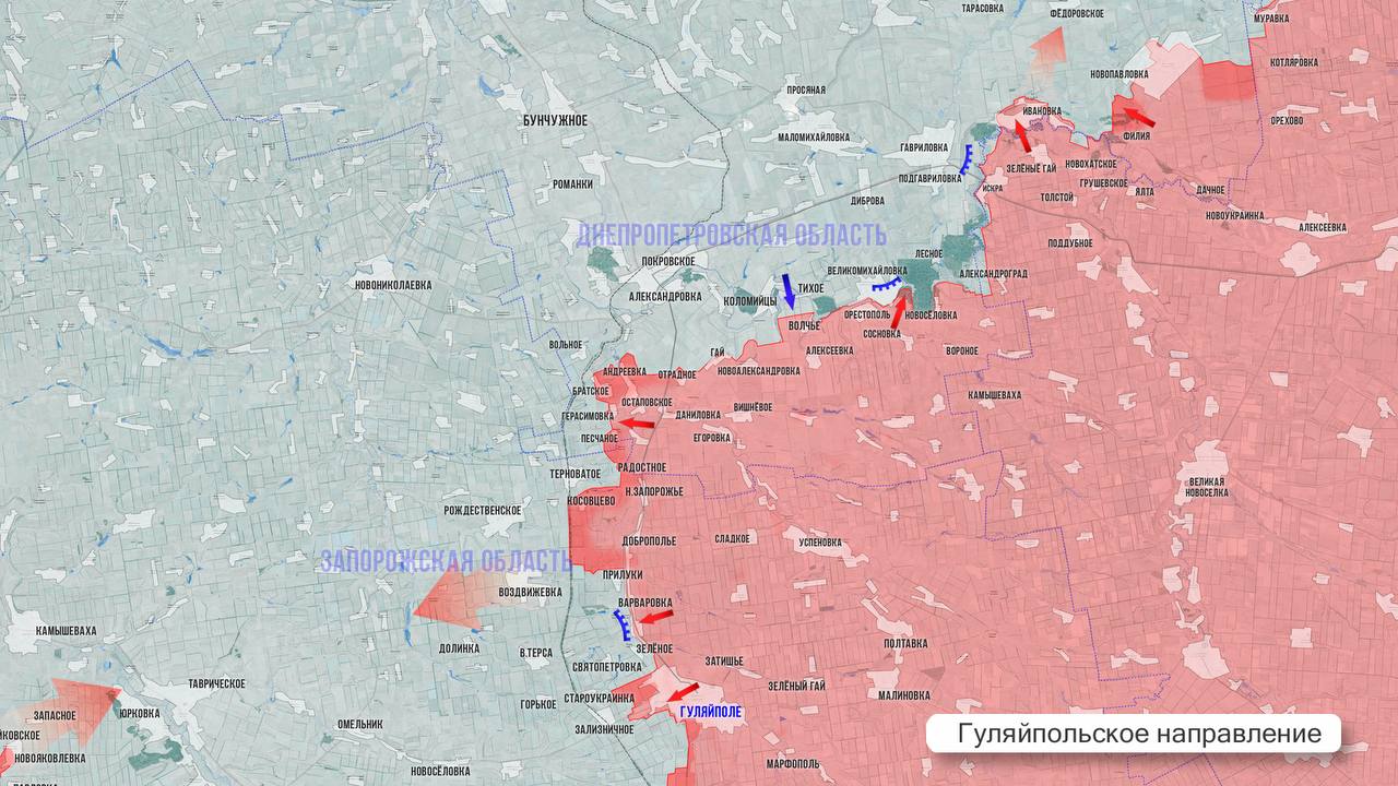 Гуляйпольский участок. Войска РФ продолжают увеличивать плацдарм на западном берегу реки Гайчур. Сегодня удалось полностью освободить поселок Зеленое. Под контроль перешел район обороны ВСУ общей площадью свыше 8 квадратных километров. От занятого Зеленого развивается наступление на Святопетровку (одновременно с юга и севера), также идут атаки в направлении Староукраинки и Зализничного. На Терноватое российские силы давят с южной стороны, там идут ожесточенные схватки. Севернее Андреевки и Отрадного (на правом берегу Гайчура) наши подразделения выходят к южным подступам Покровского.