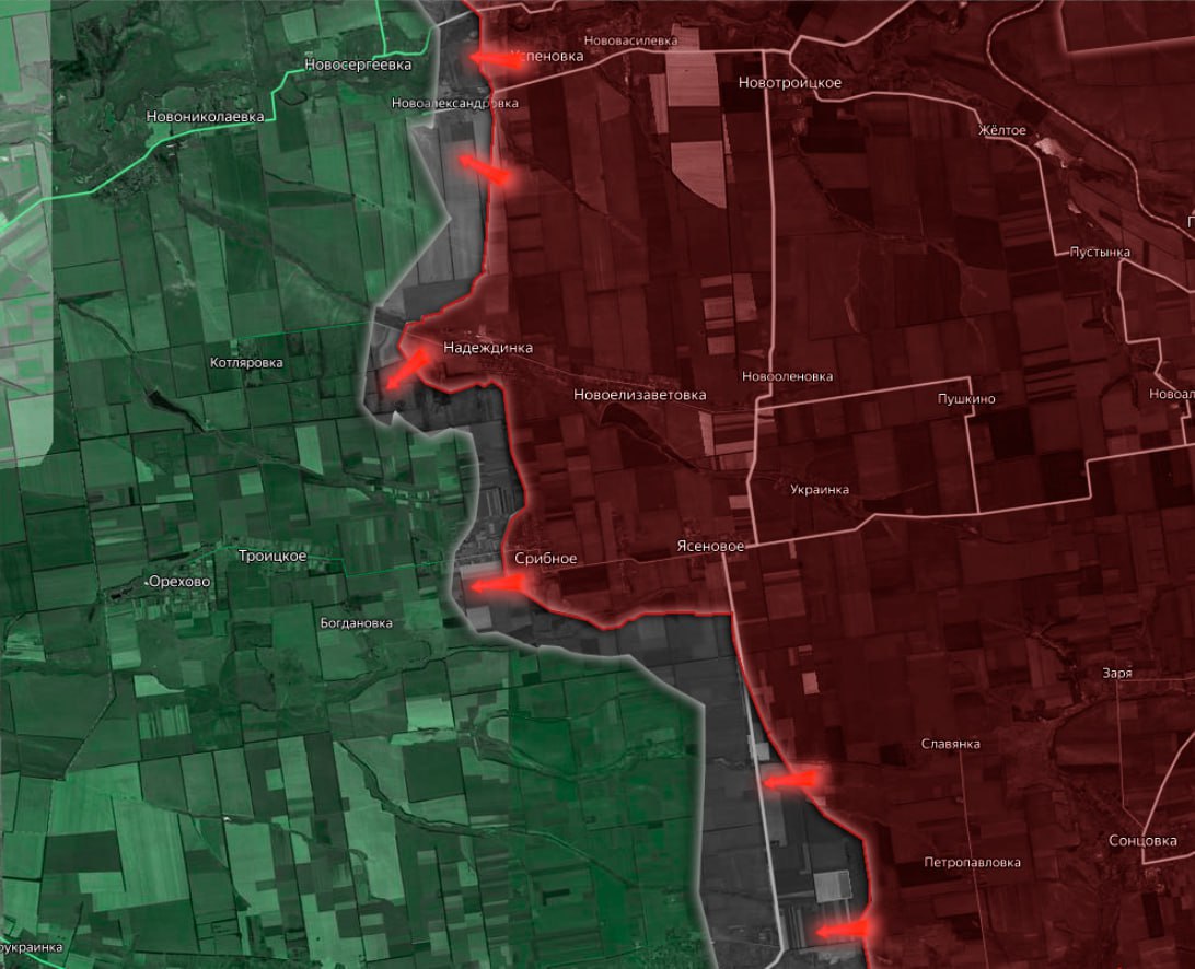 На Покровском направлении российские войска продвинулись из района н.п. Надеждинка, сумев выйти по посадкам к северным окраинам н.п. Преображенка. Таким образом атака ВС РФ на позиции ВСУ в районе н.п. Запорожье и Преображенка идет сразу с двух направлений — с севера и востока. Судя по характеру продвижения, российская армия стремится выйти к н.п. Троицкое и Ореховое, что фактически означает приближение к границам Днепропетровской области. Это развитие событий также грозит еще более глубоким охватом украинской группировки в долине реки Волчья, что может существенно осложнить положение ВСУ на данном участке фронта.