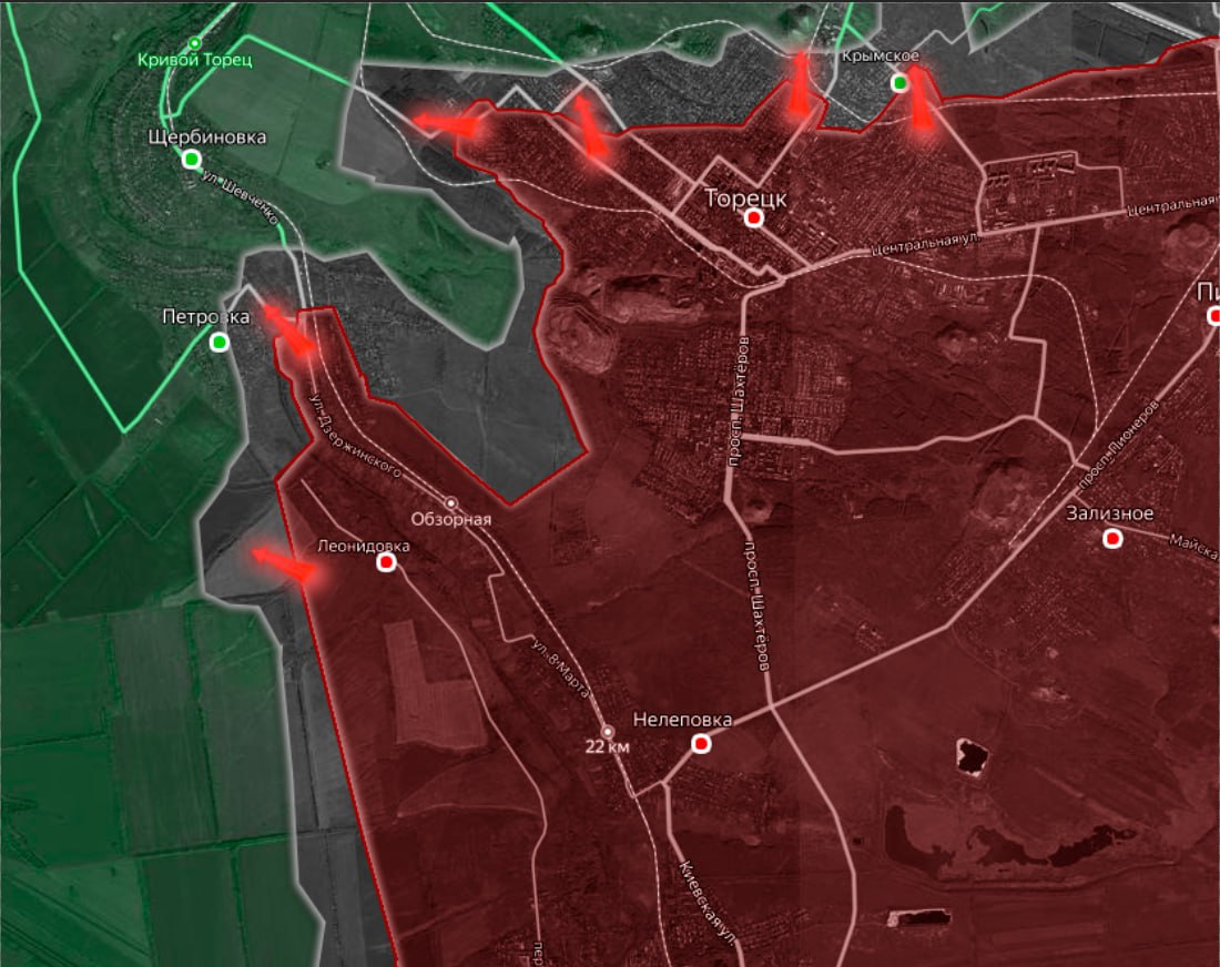 На Торецком направлении с начала года ухудшилась ситуация в Торецке. Там под контролем ВСУ остался небольшой участок на севере — шахта «Торецкая».