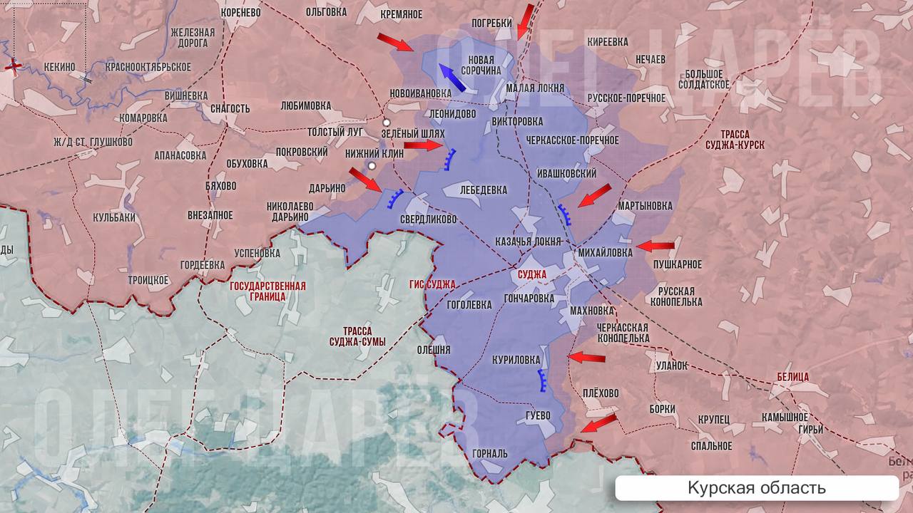 — Российские войска пока не форсируют реку Псёл и начали окружение группировки ВСУ с юга через Сумскую область, стремясь занять ключевые высоты и отрезать пути снабжения украинских частей в Курской области.
