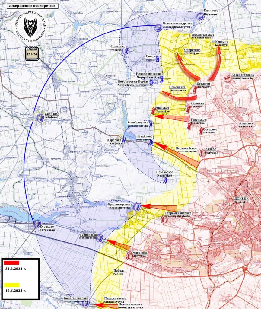 К концу первой декады июня ВС РФ продвинулись на широком участке восточнее Новоалександровки и вышли за ставки, расположенные юго-западнее Калиново. Продолжили давить и продвигаться в районе населëнных пунктов Сокол и Новопокровское, а также севернее Уманского.