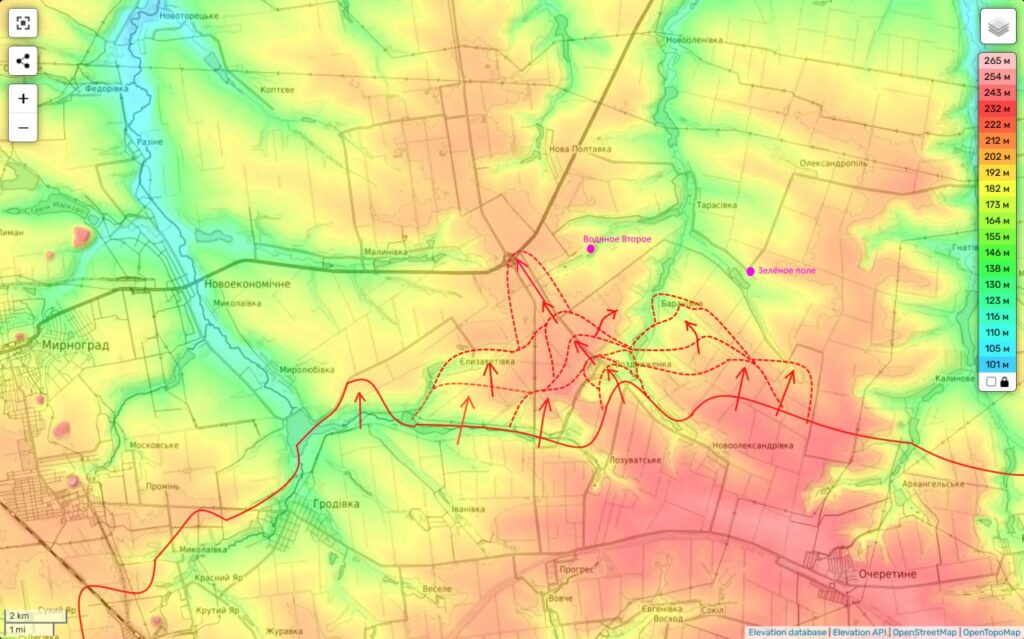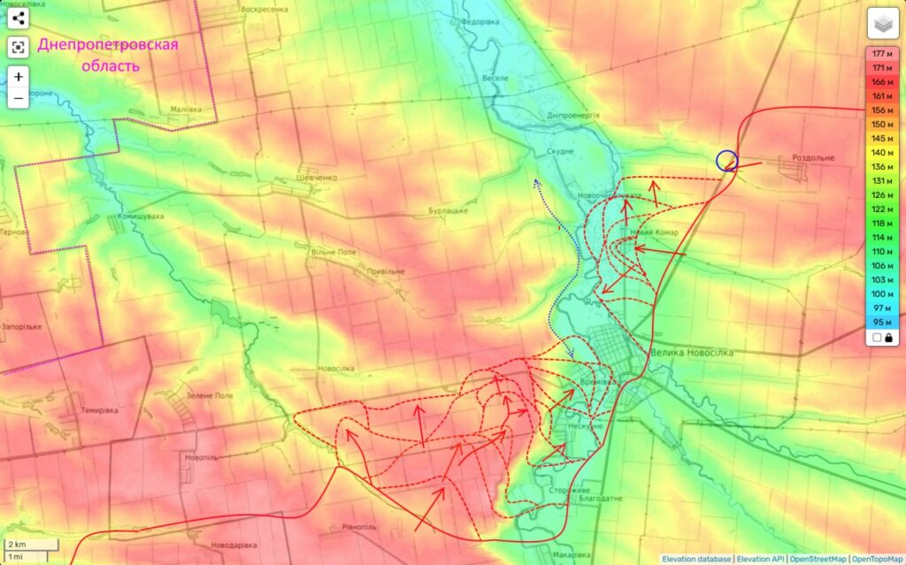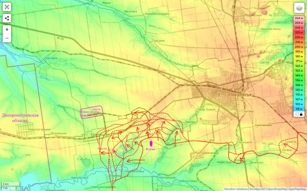 Таким образом фронт противника продолжает уверенно трещать и поддаваться назад, приближая нас сразу к двум целям — глубокому охвату Покровской агломерации с запада и … выходу к Днепропетровской области. До которой из занятой нами части Удачного осталось всего 5 км. А с западной окраины его будет и вовсе чуть больше 2 км.