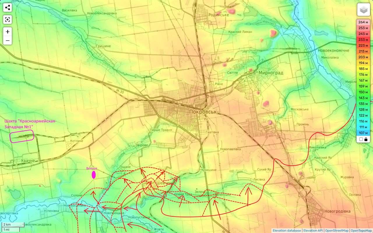 Таким образом этот участок фронта выполняет свою главную функцию (обеспечения наступления ВС РФ на Покровском направлении) и мы постепенно при этом движемся к границам Днепропетровской области. До которой нам осталось пройти около 8 км.