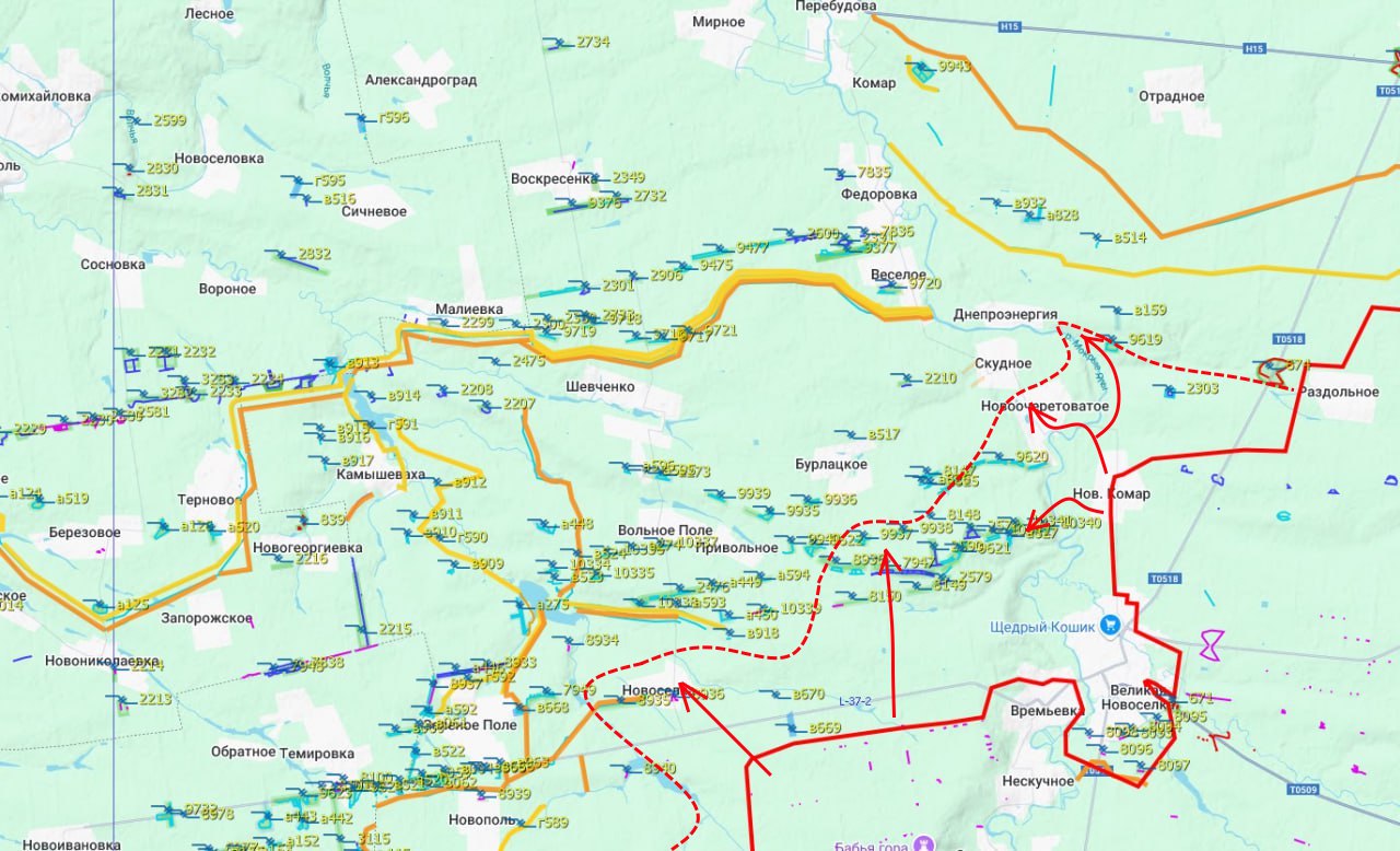 Западнее, в районе Елизаветовки и Малиновки, оборона противника более стойкая, а потому и наши атаки мене успешны. Тем не менее. Пока это не критично (хотя и неприятно и связывает руки нашим атакующим частям в районе Тарасовки). И минимум с Елизаветовкой надо что-то делать.