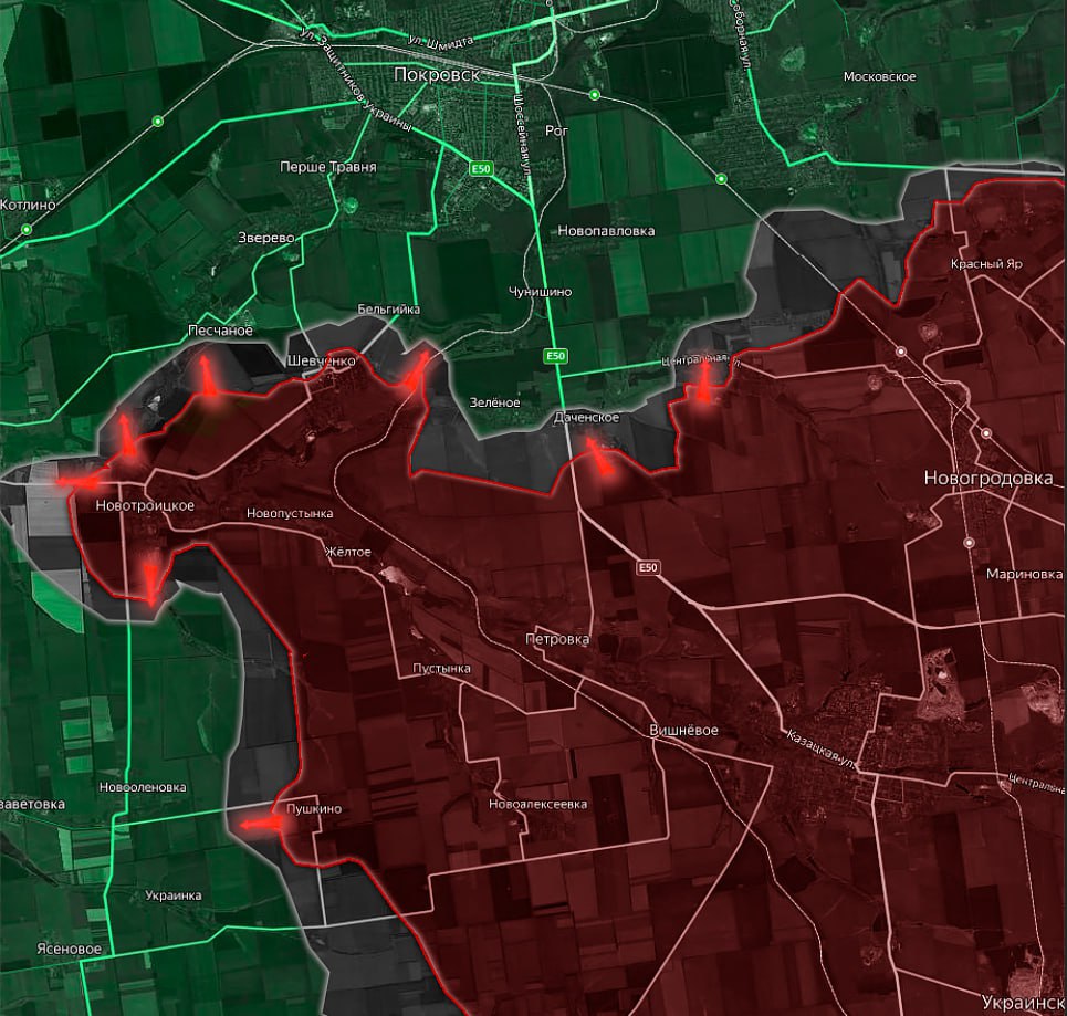 На Покровском направлении фиксируются атаки ВС РФ на н.п. Волчье (с юга), на ж/д станцию Чунишино с юго-востока (со стороны Даченского) и с юго-запада (со сторон н.п. Шевченко, вдоль ж/д полотна), идут бои внутри села Песчаное. Судя по всему, российские войска пытаются полностью прорвать первую линию обороны Покровской агломерации сразу во многих местах, чтобы далее, опираясь на эти позиции, приступить к дальнейшему более глубокому охвату частей украинской армии в Покровске и Мирнограде.