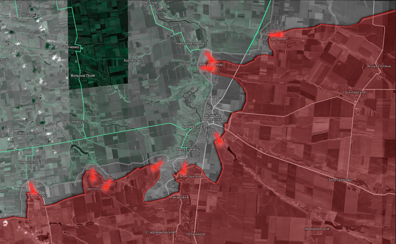 На Времьевском направлении ВС РФ после занятия н.п. Новый Комар укрепляют здесь свои позиции, а бои постепенно смещаются на север. Судя по всему, в дальнейшем российские войска будут продвигаться со стороны Ровнополя, а также пытаться перерезать трассу на Гуляйполе. При этом Вооруженные силы Украины эффективно держат оборону на данном участке фронта, понимая, что продвижения российской армии создаст угрозу захвата ими Великой Новоселки.
