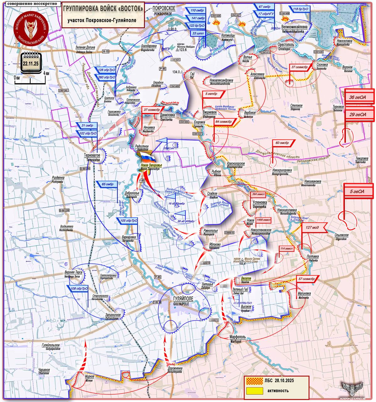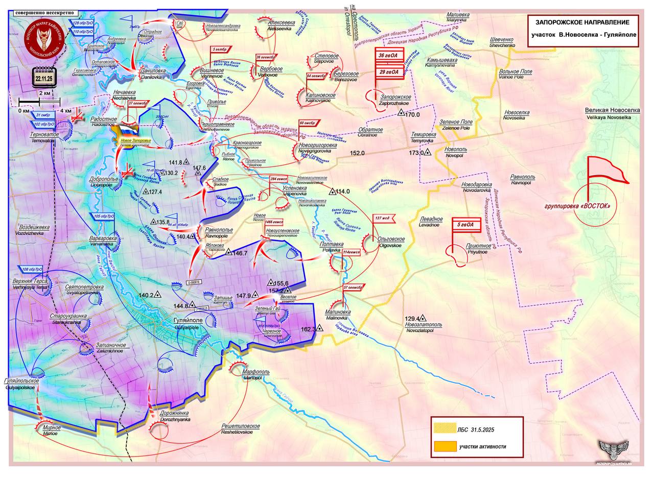 С середины ноября соединения группировки «Восток» последовательно развивают наступление вдоль правобережья Гайчура, следуя в южном направлении. После зачистки Нового Запорожья российские подразделения вышли на рубежи обороны противника у Доброполья — ключевого транспортного узла, связанного с другими опорными пунктами украинских сил через Варваровку и систему балок в междуречье. Создаются все условия для решающего этапа операции по взятию Гуляйполя, куда российские войска постепенно выдвигаются на исходные позиции.