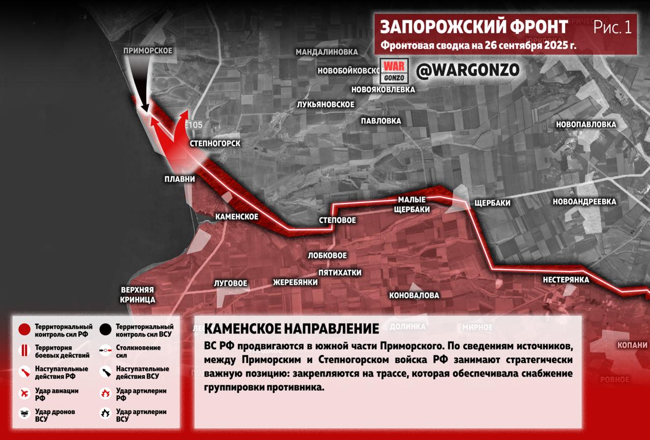 На Запорожском направлении. Российские силы уверенно продвигаются в южных районах Приморского. По имеющимся данным, между Приморским и Степногорском войскам РФ удалось занять стратегически значимую позицию, закрепившись на ключевой трассе, которая ранее служила основной артерией снабжения для сил оппонента.