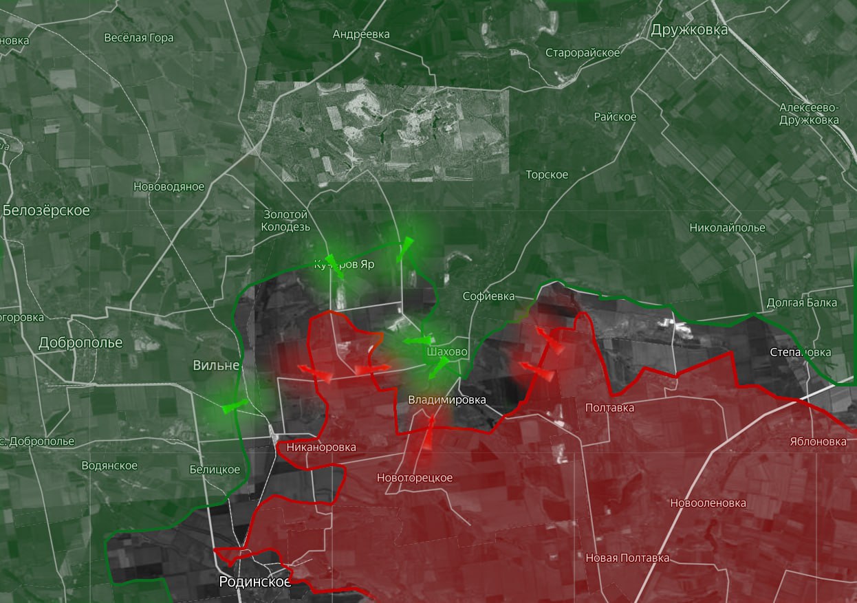 Впрочем, восточнее этого же участка картина зеркальная: уже российские подразделения сумели продавить оборону и продвинуться к югу от Новоторецкого и Владимировки.