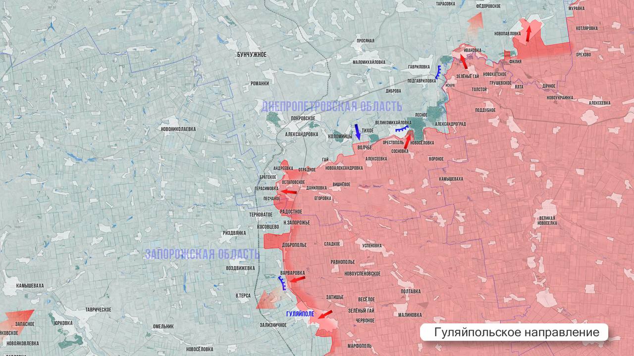 Запорожский фронт Здесь отмечается продвижение наших сил в Приморском. Севернее Степногорска российские подразделения двигаются в сторону Веселянки, а восточнее этого населенного пункта расширяют плацдарм в окрестностях Лукьяновского. В юго-западных окрестностях Гуляйполя зона контроля армии России увеличилась еще на 5 квадратных километров. Идет движение к селам Воздвиженка и Прилуки, атакуется Косовцево. После того как было освобождено Заречное, под контроль взят оборонительный район ВСУ площадью до 9 кв. км, а также отрезок трассы между Терноватым и Братским. Поступают сведения, что противник выбит из самого Братского. Также есть успехи к северо-западу от Филии.