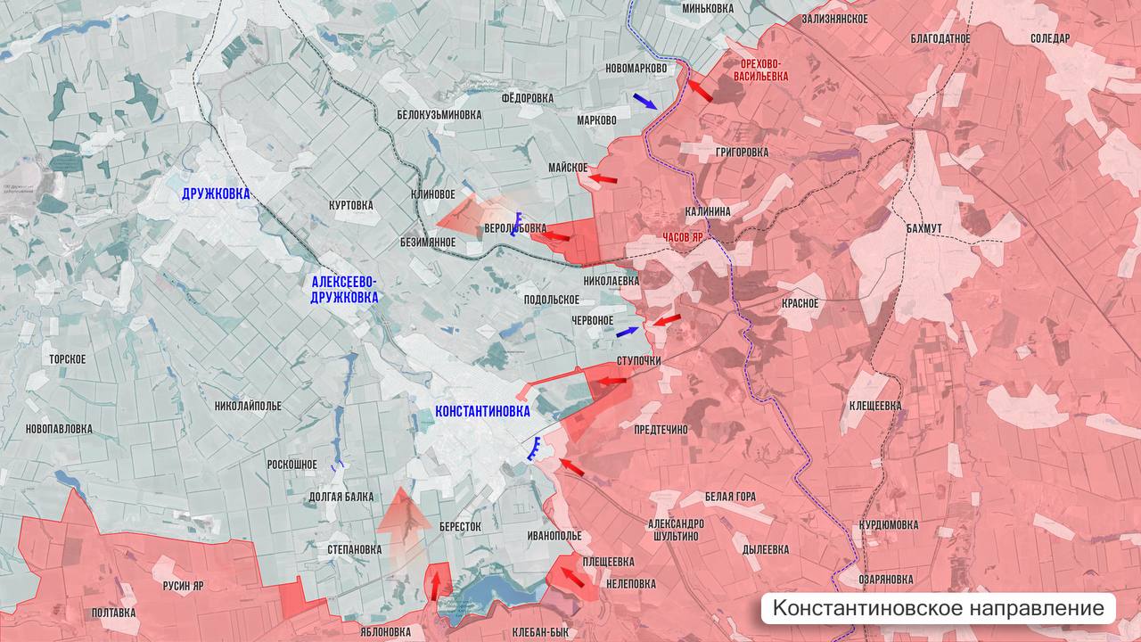 Константиновка Пехота противника малыми группами концентрируется в частном секторе и к северу от железнодорожного вокзала. ВСУ перебросили в город дополнительные расчеты беспилотников, что существенно тормозит продвижение российских частей. ВС РФ, расширив зону контроля на юге города, ведут охоту на операторов дронов, уничтожают антенны и ретрансляторы врага. Ожесточенные бои идут на линии Клиновое — Веролюбовка — Марково, а также в Миньковке.