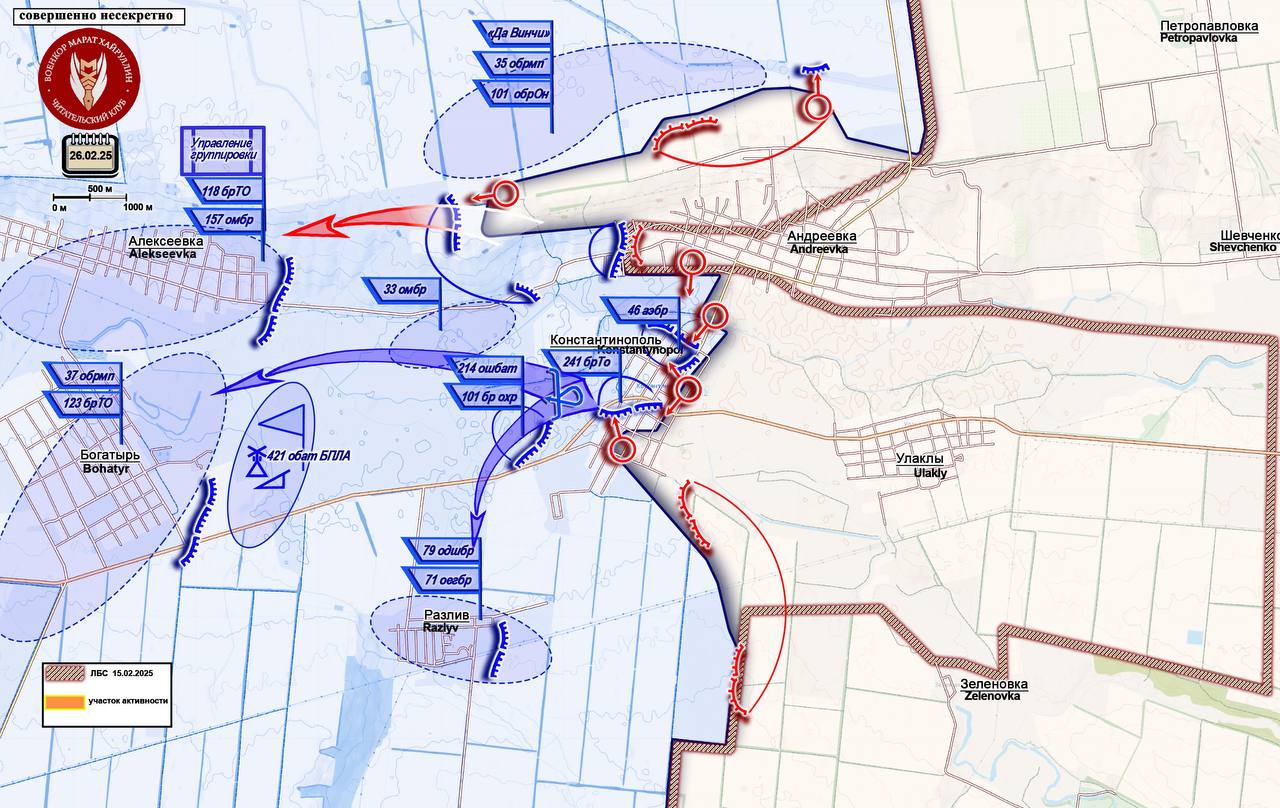 В Константинополе, после разрозненного выхода оттуда сил 79-й бригады ВСУ в район населённых пунктов Разлив и Богатырь, приведшего к очень высоким потерям их личного состава и техники, остаются немногочисленные, практически не координирующие между собой очаги сопротивления. Можно ожидать в ближайшее время окончательного освобождения Константинополя, что будет влиять на ситуацию в районе Андреевки и Алексеевки.