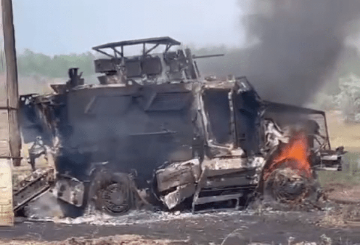 Кадры со стороны противника. Уничтоженный американский бронеавтомобиль International MaxxPro ВСУ где-то на фронте.