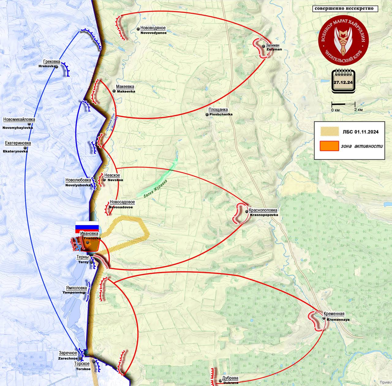 В районе Тернов на Торском участке вооружённые силы России перешли на левый берег реки Жеребец и освободили населённый пункт Ивановка. Формирование в этом районе плацдарма на другом берегу реки важно для последующего выхода на высоты хребта, лежащего западнее. Овладение данными высотами создаст условия для последующего наступления на Торское, Заречное и Лиман.