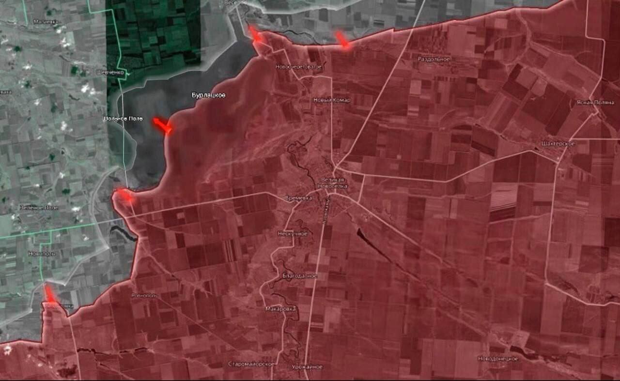 На Времьевском направлении российские войска продолжают наступление севернее Великой Новоселки, создавая давление на оборонительные позиции украинских сил. Идут бои за Вольное Поле и высоты севернее, которые являются ключевыми опорными пунктами украинской армии на данном участке фронта. Потеря этих позиций может значительно усложнить удержание ВСУ линии обороны. Кроме того, зафиксировано продвижение ВС РФ в районе Бурлацкого, что ограничивает возможности украинских войск для перегруппировки.