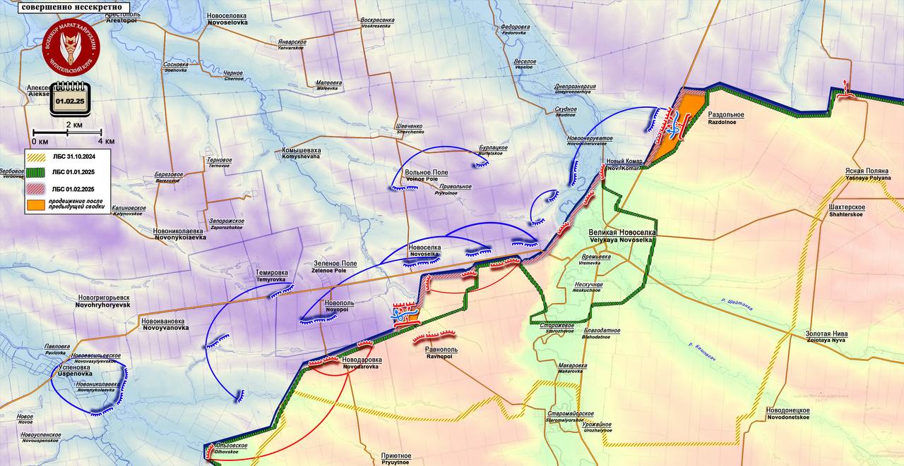 Донецкое направление: В районе Великой Новосёлки ВС РФ расширили контроль вдоль дороги Великая Новосёлка — Богатырь, зачистили крупный опорный пункт под Раздольным, отбросили противника севернее Ровнополя.