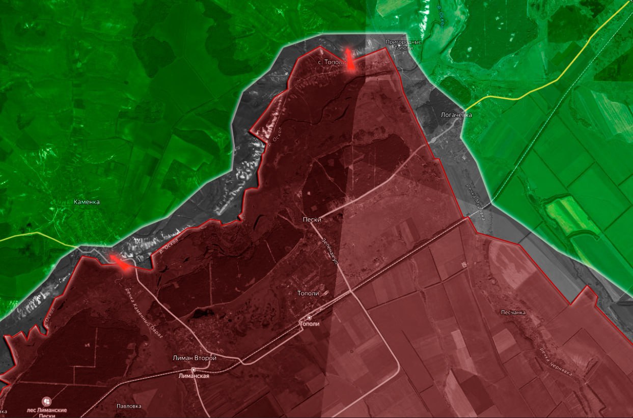 На Купянском направлении российские войска захватили населенный пункт Тополи — бои за это село длились несколько недель. Также российские подразделения продолжают продвигаться в лесных массивах западнее Тополи, создавая угрозу для оборонительных позиций ВСУ. Наступательные действия развиваются в районах Западного, Двуречной и Фиголевки, где армия РФ пытается вынудить украинские подразделения отойти на новые рубежи.