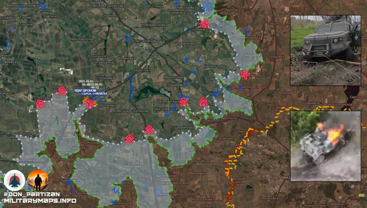 Мирноградско-Торецкое направление на 05.06.25: охват Константиновки с запада — обстановка. Здесь противник продолжает (хоть и с большим трудом) удерживать нас в районе Полтавки и Русина Яра. Он бросил на этот рубеж все и пока это дает результат.