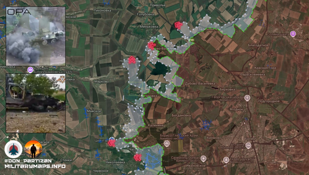 Продолжаются активные боевые действия в районе Яблоновки, где ВС РФ продвинулись к центру населённого пункта. Российские войска заняли позиции вдоль трассы на Константиновку.