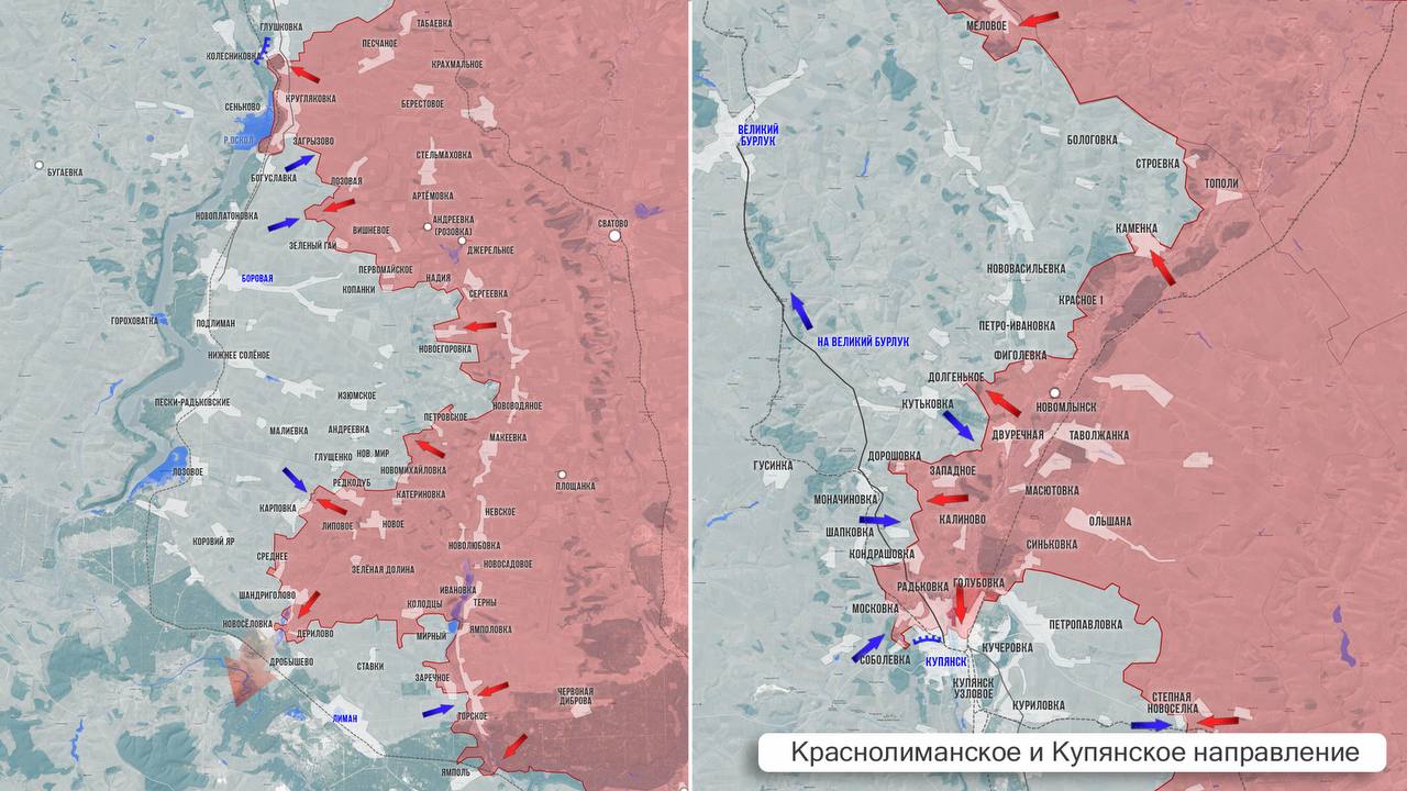 Напряжённая ситуация и в Купянске, где бои уже идут непосредственно в городской черте. В районе Московки и Соболевки противник предпринимает контратакующие действия. В самом городе российские штурмовые группы медленно продвигаются вглубь микрорайона Юбилейный. Горячо и в районе железнодорожной станции Купянск-Узловая. Восточнее Петропавловки столкновения идут с переменным успехом для обеих сторон.