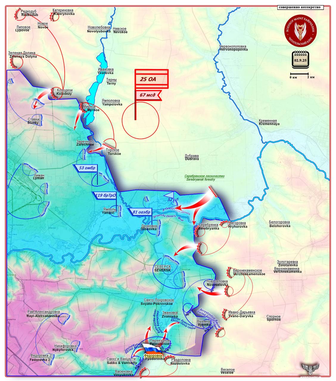 Очень серьезная и сложная задача (если она так поставлена), позволяющая, в случае ее реализации, занять очень выгодные позиции южнее Северска и разрезать оборону врага по меридиану. При синхронной поддержке с севера, с рубежа Серебрянка, может получиться очень интересная комбинация.