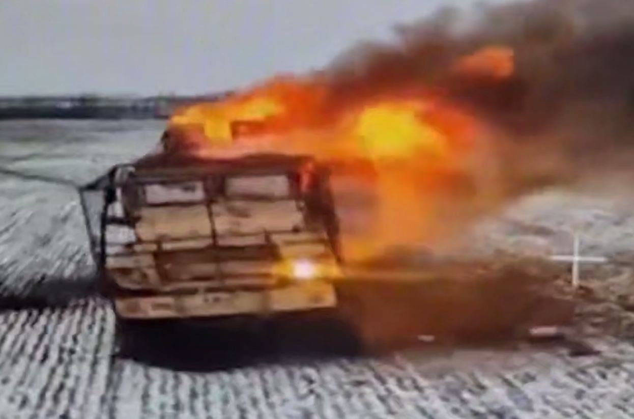Выведенный из строя русским FPV-дроном украинский военный грузовик, который боевики ВСУ пытаются эвакуировать