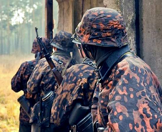 Этот камуфляж называется platanenmuster (листья платана), он напрямую ассоциируется с войсками СС и изготовлялся до 1942 года. Далее был создан двухсторонний вариант этого камуфляжа, на одной стороне дубовые листья, на другой листья платана, выпускался до 1943.