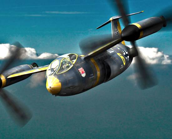 Это чудо называется Weserflug P.1003 — проект самолета с вертикальным взлетом и посадкой, революционная идея для того времени от компании Weserflug, датированный 1938-м годом. Самым уникальным в этом проекте были крылья, примерно половина в каждой консоли могла поворачиваться относительно центроплана на специальных шарнирных узлах. На концах консолей планировалось установить гондолы с редукторами, передающими усилие на винты, который могли поднимать аппарат как вверх, так и вниз и вперед. Двигать размещался за экипажем в фюзеляже. Проект так и не вышел за рамки чертежной доски, но его в 1990-е осуществили в США — речь идет про конвертоплан V-22 «Оспрей», на самом деле почти бесполезная, безумно дорогая и опасная техника.